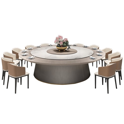 片尺寸价格说明定做服务。酒店粤菜餐厅16人位实木电动餐桌大圆桌是一款适合大型聚会的高端餐桌。它采用优质实木材质,结实耐用,表面涂有环保漆,光泽细腻。餐桌中央有一个电动岩板转盘,可以自动旋转,方便食客享用各种美味的粤菜。餐桌的直径为2.4米,可以容纳16人同时就餐,非常适合酒店、饭店、会所等场所使用。