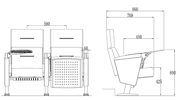 2.座椅基本中心距为590±1.0mm,座包打开侧深708±1.0mm,座包深度450±1.0mm,基本椅高为1000±1.0mm。最小排距:900mm。